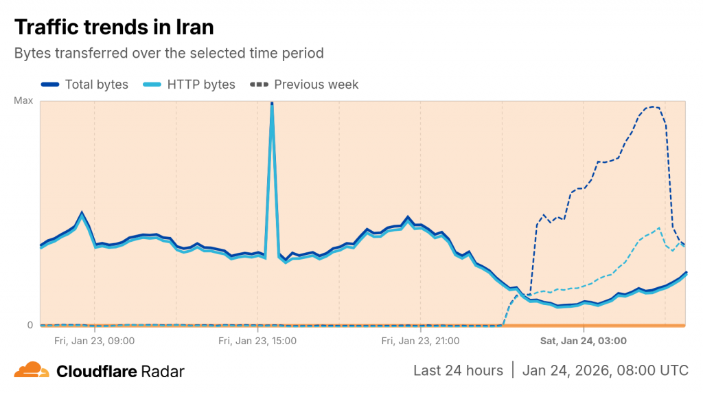با این حال رادار کلادفلر نشانهای از اتصال گسترده و ترافیک عادی از سمت ایران ندارد و وضعیت ترافیک ایران در مقایسه با قبل از ۱۸ دی تقریبا صفر است.
