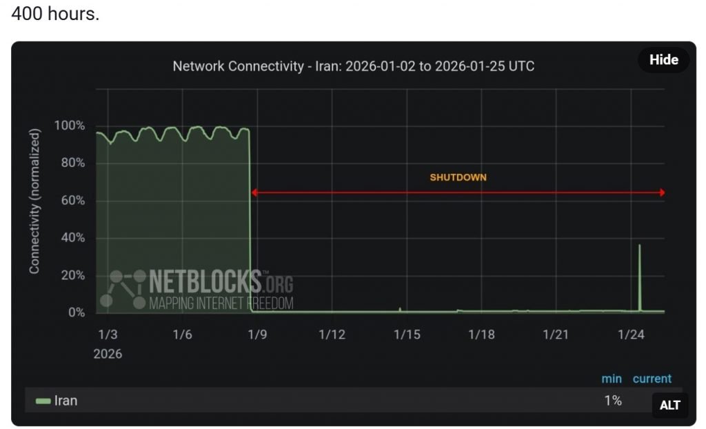 نت‌بلاکس حدود یک ساعت پیش نمودار وضعیت اینترنت در ایران را با توضیحی دو کلمه‌ای منتشر کرد: ۴۰۰ ساعت.